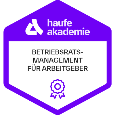 Empfänger:innen dieses Badges haben an einer betrieblichen Weiterbildung der Haufe Akademie teilgenommen. Die betriebliche Weiterbildung vermittelte profundes Wissen und Kompetenzen mit höchsten Anforderungen an Aktualität, Qualität und Praxisrelevanz. Ausgewählte Top-Referent:innen, State-of-the-Art Inhalte und erprobte Lerntransfertools befähigen die Empfänger:innen dieses Badges dazu, das vermittelte Know-how wirksam in die Praxis umzusetzen.