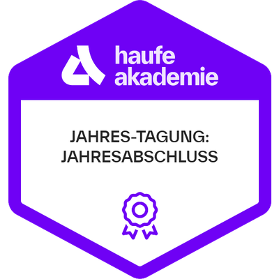 Empfänger:innen dieses Badges haben an einer betrieblichen Weiterbildung der Haufe Akademie teilgenommen. Die betriebliche Weiterbildung vermittelte profundes Wissen und Kompetenzen mit höchsten Anforderungen an Aktualität, Qualität und Praxisrelevanz. Ausgewählte Top-Referent:innen, State-of-the-Art Inhalte und erprobte Lerntransfertools befähigen die Empfänger:innen dieses Badges dazu, das vermittelte Know-how wirksam in die Praxis umzusetzen.