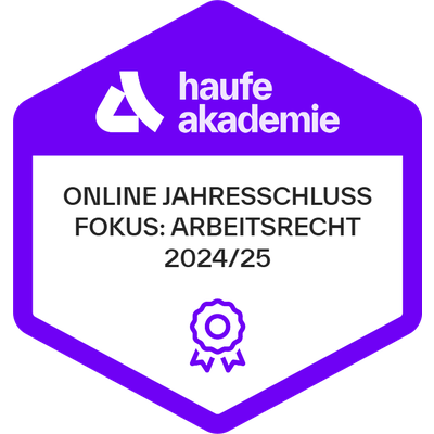 Empfänger:innen dieses Badges haben an einer betrieblichen Weiterbildung der Haufe Akademie teilgenommen. Die betriebliche Weiterbildung vermittelte profundes Wissen und Kompetenzen mit höchsten Anforderungen an Aktualität, Qualität und Praxisrelevanz. Ausgewählte Top-Referent:innen, State-of-the-Art Inhalte und erprobte Lerntransfertools befähigen die Empfänger:innen dieses Badges dazu, das vermittelte Know-how wirksam in die Praxis umzusetzen.