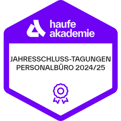 Empfänger:innen dieses Badges haben an einer betrieblichen Weiterbildung der Haufe Akademie teilgenommen. Die betriebliche Weiterbildung vermittelte profundes Wissen und Kompetenzen mit höchsten Anforderungen an Aktualität, Qualität und Praxisrelevanz. Ausgewählte Top-Referent:innen, State-of-the-Art Inhalte und erprobte Lerntransfertools befähigen die Empfänger:innen dieses Badges dazu, das vermittelte Know-how wirksam in die Praxis umzusetzen.