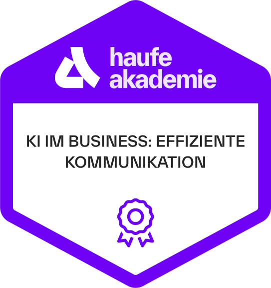 Empfänger:innen dieses Badges haben an einer betrieblichen Weiterbildung der Haufe Akademie teilgenommen. Die betriebliche Weiterbildung vermittelte profundes Wissen und Kompetenzen mit höchsten Anforderungen an Aktualität, Qualität und Praxisrelevanz. Ausgewählte Top-Referent:innen, State-of-the-Art Inhalte und erprobte Lerntransfertools befähigen die Empfänger:innen dieses Badges dazu, das vermittelte Know-how wirksam in die Praxis umzusetzen.