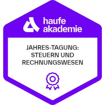 Empfänger:innen dieses Badges haben an einer betrieblichen Weiterbildung der Haufe Akademie teilgenommen. Die betriebliche Weiterbildung vermittelte profundes Wissen und Kompetenzen mit höchsten Anforderungen an Aktualität, Qualität und Praxisrelevanz. Ausgewählte Top-Referent:innen, State-of-the-Art Inhalte und erprobte Lerntransfertools befähigen die Empfänger:innen dieses Badges dazu, das vermittelte Know-how wirksam in die Praxis umzusetzen.