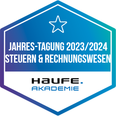 Empfänger:innen dieses Badges haben an einer betrieblichen Weiterbildung der Haufe Akademie teilgenommen. Die betriebliche Weiterbildung vermittelte profundes Wissen und Kompetenzen mit höchsten Anforderungen an Aktualität, Qualität und Praxisrelevanz. Ausgewählte Top-Referent:innen, State-of-the-Art Inhalte und erprobte Lerntransfertools befähigen die Empfänger:innen dieses Badges dazu, das vermittelte Know-how wirksam in die Praxis umzusetzen.
