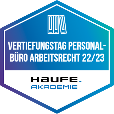 Empfänger:innen dieses Badges haben an einer betrieblichen Weiterbildung der Haufe Akademie teilgenommen. Die betriebliche Weiterbildung vermittelte profundes Wissen und Kompetenzen mit höchsten Anforderungen an Aktualität, Qualität und Praxisrelevanz. Ausgewählte Top-Referent:innen, State-of-the-Art Inhalte und erprobte Lerntransfertools befähigen die Empfänger:innen dieses Badges dazu, das vermittelte Know-how wirksam in die Praxis umzusetzen.